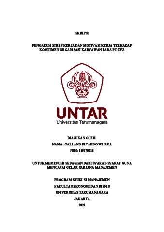 WIJAYA, GALLAND RICARDO (2022) PENGARUH STRES KERJA DAN MOTIVASI KERJA TERHADAP KOMITMEN ORGANISASI KARYAWAN PADA PT XYZ. Skripsi thesis, Universitas Tarumanagara.