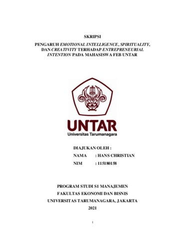 CHRISTIAN, HANS (2022) PENGARUH EMOTIONAL INTELLIGENCE, SPIRITUALITY, DAN CREATIVITY TERHADAP ENTREPRENEURIAL INTENTION PADA MAHASISWA FEB UNTAR. Skripsi thesis, Universitas Tarumanagara.