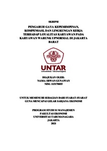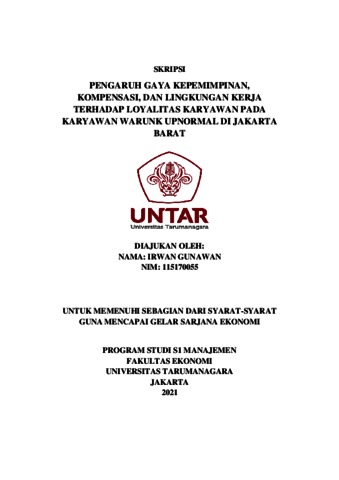 GUNAWAN, IRWAN (2022) PENGARUH GAYA KEPEMIMPINAN, KOMPENSASI, DAN LINGKUNGAN KERJA TERHADAP LOYALITAS KARYAWAN PADA KARYAWAN WARUNK UPNORMAL DI JAKARTA BARAT. Skripsi thesis, Universitas Tarumanagara.