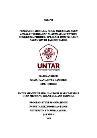 HANDOKO, IVAN ADITYA (2022) PENGARUH REWARD, GOOD PRICE DAN USER LOYALTY TERHADAP PURCHASE INTENTION PENGGUNA PRODUK APLIKASI MOBILE GAME FREE FIRE DI JABODETABEK. Skripsi thesis, Universitas Tarumanagara.