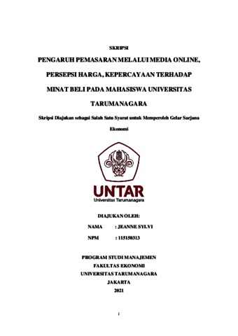 SYLVI, JEANNE (2021) PENGARUH PEMASARAN MELALUI MEDIA ONLINE, PERSEPSI HARGA, KEPERCAYAAN TERHADAP MINAT BELI PADA MAHASISWA UNIVERSITAS TARUMANAGARA. Skripsi thesis, Universitas Tarumanagara.