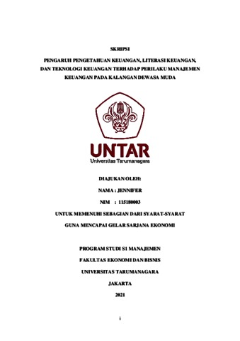JENNIFER, JENNIFER (2022) PENGARUH PENGETAHUAN KEUANGAN, LITERASI KEUANGAN, DAN TEKNOLOGI KEUANGAN TERHADAP PERILAKU MANAJEMEN KEUANGAN PADA KALANGAN DEWASA MUDA. Skripsi thesis, Universitas Tarumanagara.