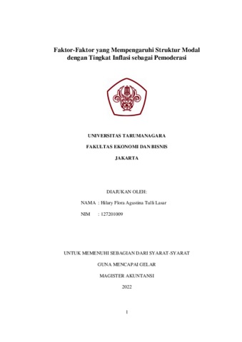Lasar, Hilary Flora Agustina Tulli (2022) Faktor-Faktor yang Mempengaruhi Struktur Modal dengan Tingkat Inflasi sebagai Pemoderasi. Masters thesis, UNIVERSITAS TARUMANAGARA.