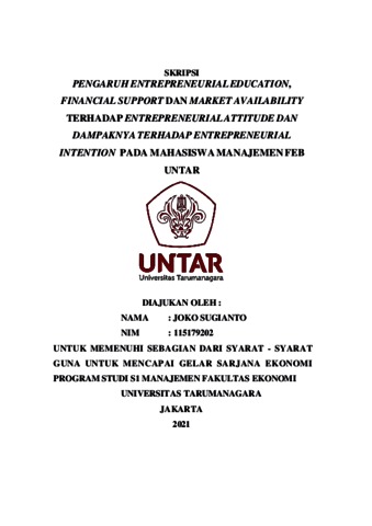 SUGIANTO, JOKO (2021) PENGARUH ENTREPRENEURIAL EDUCATION, FINANCIAL SUPPORT DAN MARKET AVAILABILITY TERHADAP ENTREPRENEURIAL ATTITUDE DAN DAMPAKNYA TERHADAP ENTREPRENEURIAL INTENTION PADA MAHASISWA MANAJEMEN FEB UNTAR. Skripsi thesis, Universitas Tarumanagara.