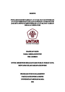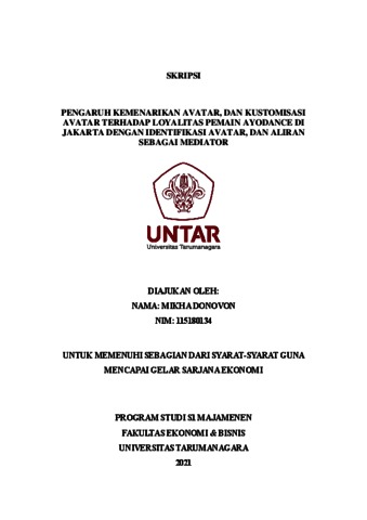 DONOVON, MIKHA (2022) PENGARUH KEMENARIKAN AVATAR, DAN KUSTOMISASI AVATAR TERHADAP LOYALITAS PEMAIN AYODANCE DI JAKARTA DENGAN IDENTIFIKASI AVATAR, DAN ALIRAN SEBAGAI MEDIATOR. Skripsi thesis, Universitas Tarumanagara.