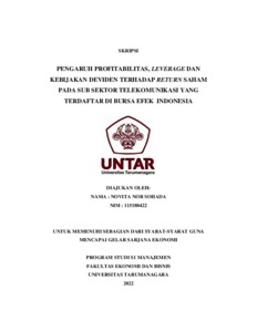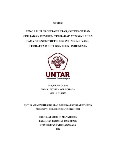 SOHADA, NOVITA NOR (2022) PENGARUH PROFITABILITAS, LEVERAGE DAN KEBIJAKAN DEVIDEN TERHADAP RETURN SAHAM PADA SUB SEKTOR TELEKOMUNIKASI YANG TERDAFTAR DI BURSA EFEK INDONESIA. Skripsi thesis, Universitas Tarumanagara.