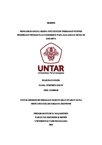 GOUW, STEPHEN (2022) PENGARUH SOCIAL MEDIA INFLUENCER TERHADAP INTENSI PEMBELIAN PENGGUNA E-COMMERCE PADA KALANGAN MUDA DI JAKARTA. Skripsi thesis, Universitas Tarumanagara.