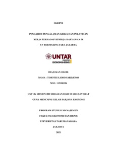 SARDJONO, TIMOTIUS JOSO (2022) PENGARUH PENGALAMAN KERJA DAN PELATIHAN KERJA TERHADAP KINERJA KARYAWAN DI CV BERMAKINGTARA JAKARTA. Skripsi thesis, Universitas Tarumanagara.