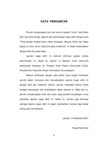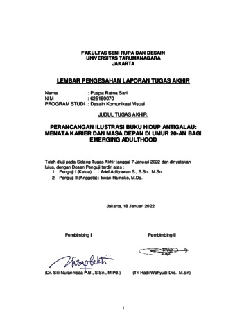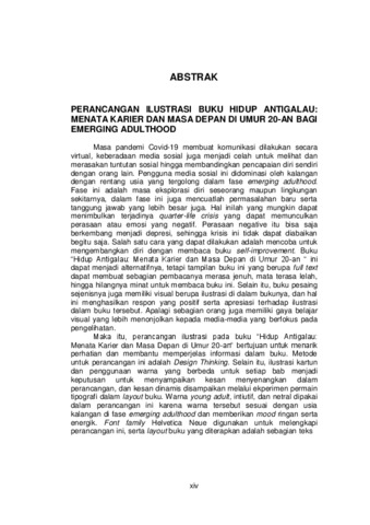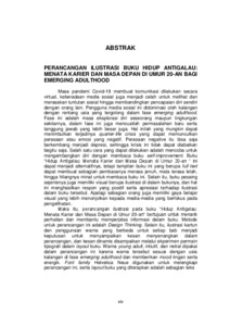virtual, keberadaan media sosial juga menjadi celah untuk melihat dan merasakan tuntutan sosial hingga membandingkan pencapaian diri sendiri dengan orang lain. Pengguna media sosial ini didominasi oleh kalangan dengan rentang usia yang tergolong dalam fase emerging adulthood. Fase ini adalah masa eksplorasi diri seseorang maupun lingkungan sekitarnya, dalam fase ini juga mencuatlah permasalahan baru serta tanggung jawab yang lebih besar juga. Hal inilah yang mungkin dapat menimbulkan terjadinya quarter-life crisis yang dapat memunculkan perasaan atau emosi yang negatif. Perasaan negative itu bisa saja berkembang menjadi depresi, sehingga krisis ini tidak dapat diabaikan begitu saja. Salah satu cara yang dapat dilakukan adalah mencoba untuk mengembangkan diri dengan membaca buku self-improvement. Buku “Hidup Antigalau: Menata Karier dan Masa Depan di Umur 20-an “ ini dapat menjadi alternatifnya, tetapi tampilan buku ini yang berupa full text dapat membuat sebagian pembacanya merasa jenuh, mata terasa lelah, hingga hilangnya minat untuk membaca buku ini. Selain itu, buku pesaing sejenisnya juga memiliki visual berupa ilustrasi di dalam bukunya, dan hal ini menghasilkan respon yang positif serta apresiasi terhadap ilustrasi dalam buku tersebut. Apalagi sebagian orang juga memiliki gaya belajar visual yang lebih menonjolkan kepada media-media yang berfokus pada pengelihatan. Maka itu, perancangan ilustrasi pada buku “Hidup Antigalau: Menata Karier dan Masa Depan di Umur 20-an“ bertujuan untuk menarik perhatian dan membantu memperjelas informasi dalam buku. Metode untuk perancangan ini adalah Design Thinking. Selain itu, ilustrasi kartun dan penggunaan warna yang berbeda untuk setiap bab menjadi keputusan untuk menyampaikan kesan menyenangkan dalam perancangan, dan kesan dinamis disampaikan melalui ekperimen permain tipografi dalam layout buku. Warna young adult, intiutif, dan netral dipakai dalam perancangan ini karena warna tersebut sesuai dengan usia kalangan di fase emerging adulthood dan memberikan mood ringan serta energik. Font family Helvetica Neue digunakan untuk melengkapi perancangan ini, serta layout buku yang diterapkan adalah sebagian teks dan ilustrasi diletakkan terpisah pada halaman yang berbeda dan sebagian ilustrasinya diletakkan bersama dengan teks di halaman yang sama. Adapun, ukuran isi bukunya yaitu 14x21 cm dan dijilid hardcover, yang memuat 224 halaman atau 56 lembar termasuk bagian cover-nya. Pada bagian isi buku digunakan kertas HVS 100 gsm dan untuk cover-nya menggunakan hardcover board yang dilapisi art paper 150 gsm. Kata Kunci: Buku Ilustrasi, Kartun, Perancangan, Self-Improvement