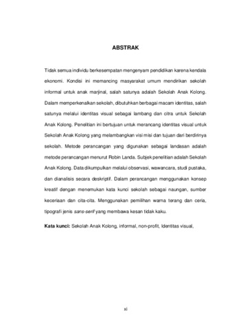 Tidak semua individu berkesempatan mengenyam pendidikan karena kendala ekonomi. Kondisi ini memancing masyarakat umum mendirikan sekolah informal untuk anak marjinal, salah satunya adalah Sekolah Anak Kolong. Dalam memperkenalkan sekolah, dibutuhkan berbagai macam identitas, salah satunya melalui identitas visual sebagai lambang dan citra untuk Sekolah Anak Kolong. Penelitian ini bertujuan untuk merancang identitas visual untuk Sekolah Anak Kolong yang melambangkan visi misi dan tujuan dari berdirinya sekolah. Metode perancangan yang digunakan sebagai landasan adalah metode perancangan menurut Robin Landa. Subjek penelitian adalah Sekolah Anak Kolong. Data dikumpulkan melalui observasi, wawancara, studi pustaka, dan dianalisis secara deskriptif. Dalam perancangan menggunakan konsep kreatif dengan menemukan kata kunci sekolah sebagai naungan, sumber keceriaan dan cita-cita. Menggunakan pemilihan warna terang dan ceria, tipografi jenis sans-serif yang membawa kesan tidak kaku. Kata kunci: Sekolah Anak Kolong, informal, non-profit, Identitas visual,