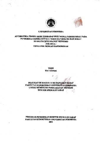 Andriani, Rini (2001) Antibiotika Profilaksis terhadap Pneumonia Nosokomial pada Penderita Cedera Kepala Tertutup Sedang dan Berat di RSUPN Cipto Mangunkusumo Jakarta: Uji Klinik dengan Randomisasi. Masters thesis, Universitas Indonesia.