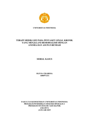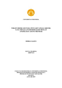 Charissa, Olivia (2019) TERAPI MEDIK GIZI PADA PENYAKIT GINJAL KRONIK YANG MENJALANI HEMODIALISIS DENGAN ANEMIA DAN ASUPAN RENDAH. Doctoral thesis, Universitas Indonesia.