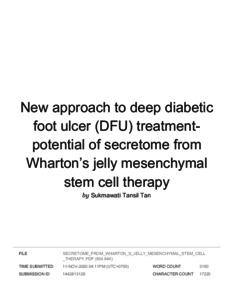 Tan, Sukmawati Tansil (2020) Turnitin "New approach to deep diabetic foot ulcer (DFU) treatment-potential of secretome from Wharton’s jelly mesenchymal stem cell therapy". International Journal of Dermatology, Venereology and Leprosy Sciences., 3 (2). ISSN E-ISSN: 2664-942X ; P-ISSN: 2664-9411 (Unpublished)