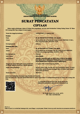 Dr. dr. SUKMAWATI TANSIL TAN, Sp.KK (2020) URL Dokumen “TINGKAT PENGETAHUAN TENTANG VAGINAL HYGIENE DAN KEPUASAN TERHADAP PENGGUNAAN V-CLEANSER FOAM BERBAHAN EKSTRAK DAUN SIRIH HIJAU“. EC00202028078.