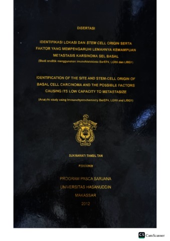 Tan, Sukmawati Tansil (2012) Identifikasi Lokasi dan Stem Cell Origin Serta Faktor yang Mempengaruhi Lemahnya Kemampuan Metastasis Karsinoma Sel Basal (Studi Analitik Menggunakan Imunohistokimia BerEP4, LGR6 dan LRIG1). Doctoral thesis, Universitas Hasanuddin.