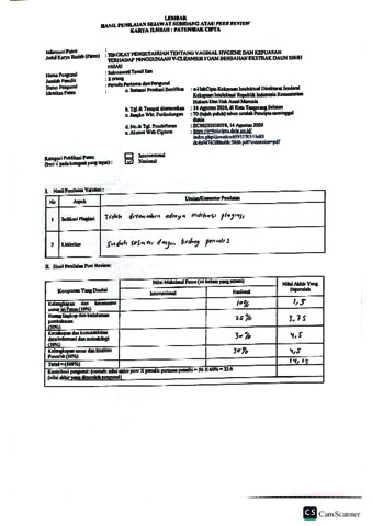 Dr. dr. SUKMAWATI TANSIL TAN, Sp.KK (2020) Peer Review + reviewer “TINGKAT PENGETAHUAN TENTANG VAGINAL HYGIENE DAN KEPUASAN TERHADAP PENGGUNAAN V-CLEANSER FOAM BERBAHAN EKSTRAK DAUN SIRIH HIJAU“. EC00202028078.