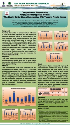 Dewi, Andriana Kumala (2021) URL Dokumen “Comparison of Sleep Quality Among Postmenopausal Women Who Live In Senior Living Communities With Those In Private Homes (Poster)“. In: ASIA PACIFIC MENOPAUSE FEDERATION THE 8TH SCIENTIFIC MEETING, 14-17 Oktober 2021, HangZhou, China.