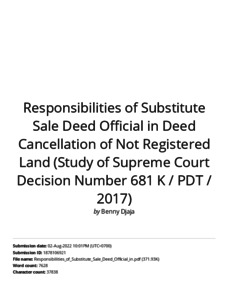 Responsibilities of Substitute Sale Deed Official in Deed Cancellation of Not Registered Land (Study of Supreme Court Decision Number 681 K _ PDT _ 2017).pdf Download (2MB) | Preview |
