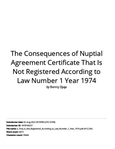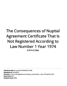 The Consequences of Nuptial Agreement Certificate That Is Not Registered According to Law Number 1 Year 1974.pdf Download (2MB) | Preview |