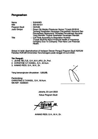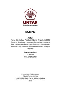 Suhandi, Suhandi (2022) Peran OJK Melalui Peraturan Nomor 71/POJK.05/2016 tentang Kesehatan Keuangan Perusahaan Asuransi dan Perusahaan Reasuransi Terhadap Perusahaan Asuransi yang Memiliki Tingkat Kesehatan Keuangan Rendah. Skripsi thesis, Universitas Tarumanagara.