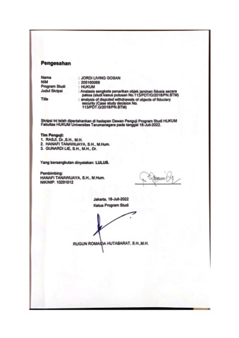 Gosan, Jordi Living (2022) Analisis sengketa penarikan objek jaminan fidusia secara paksa (studi kasus putusan NO.113/PDT.G/2018/PN.BTM). Skripsi thesis, Universitas Tarumanagara.