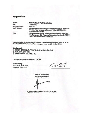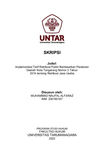 Alfaraz, Muhammad Naufal (2022) Implementasi Tarif Retribusi Parkir Berdasarkan Peraturan Daerah Kota Tangerang Nomor 3 Tahun 2014 tentang Retribusi Jasa Usaha. Skripsi thesis, Universitas Tarumanagara.