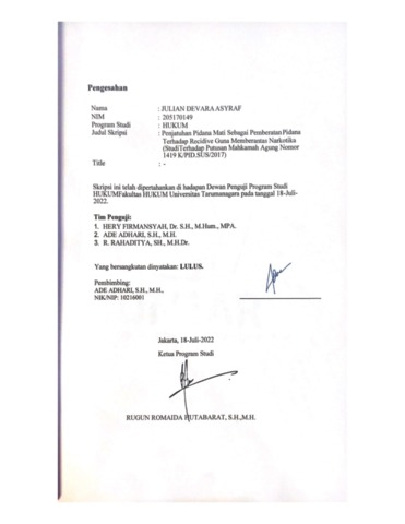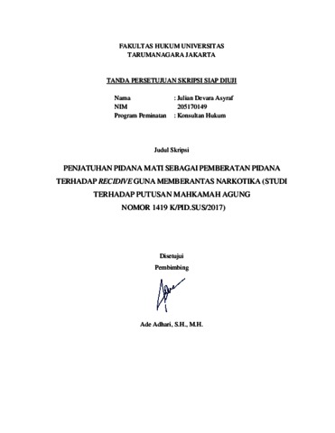 Asyraf, Julian Devara (2022) Penjatuhan Pidana Mati Sebagai Pemberatan Pidana Terhadap Recidive Guna Memberantas Narkotika (Studi Terhadap Putusan Mahkamah Agung Nomor K.PID.SUS/2017. Skripsi thesis, Universitas Tarumanagara.