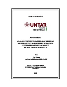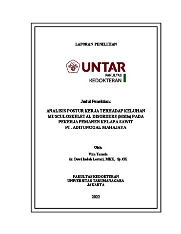 Teresia, Vira and Lestari, Dewi Indah (2022) ANALISIS POSTUR KERJA TERHADAP KELUHAN MUSCULOSKELETAL DISORDERS (MSDs) PADA PEKERJA PEMANEN KELAPA SAWIT PT. ADITUNGGAL MAHAJAYA. [Experiment]