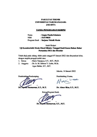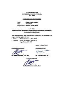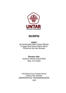 Eskatara, Gugus Pandu (2021) Uji karakteristik mesin diesel silinder tunggal studi kasus bahan bakar pertamina dex dan biosolar (TM - 1315). Skripsi thesis, Universitas Tarumanagara.