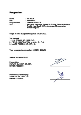 Patrick, Patrick (2022) Pengaruh parameter proses 3d printing terhadap kualitas produk hasil cetak 3d printer dengan menggunakan metode taguci (T. Ind - 706). Skripsi thesis, Universitas Tarumanagara.