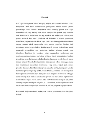 Ikan kayu adalah produk olahan ikan yang menjadi makanan khas Sulawesi Utara. Pengolahan ikan kayu membutuhkan penanganan khusus karena proses produksinya secara manual. Penjaminan mutu terhadap produk ikan kayu merupakan hal yang penting untuk dapat menghasilkan produk yang bermutu baik. Penelitian ini menjelaskan tentang perbaikan dan peningkatan kualitas pada proses produksi ikan kayu. Penelitian ini dilakukan di sebuah perusahaan manufaktur yang memproduksi ikan kayu. Penelitian ini menggunakan studi kasus tunggal dengan teknik pengambilan data random sampling. Penting bagi perusahaan untuk memperhatikan kualitas produk dengan berkomitmen untuk memenuhi pengendalian dan penjaminan kualitas terhadap produk yang dihasilkan. Penelitian ini bertujuan untuk menganalisis pemborosan dan merekomendasikan tindakan perbaikan sehingga dapat meningkatkan kualitas produk ikan kayu. Dalam meningkatkan kualitas digunakan metode lean six sigma dengan tahapan DMAIC. Hasil penelitian menunjukkan bahwa menunggu, cacat, dan penyimpanan merupakan pemborosan yang sering terjadi pada proses produksi ikan kayu. Hasil kapabilitas proses untuk Cp dan Cpk kurang dari 1, maka kapabilitas proses tergolong rendah. Pada akhirnya, penelitian ini menunjukkan bahwa perusahaan telah mampu mengidentifikasi penyebab pemborosan sehingga dapat meningkatkan efisiensi dan kualitas produk ikan kayu. Hasil implementasi memberikan dampak positif, dimana nilai DPMO menurun menjadi 759,35811 dan tingkat sigma meningkat menjadi 4,671. Akan tetapi, evaluasi perlu dilakukan secara terus-menerus agar dapat memberikan manfaat yang baik bagi perusahaan. Kata kunci: penjaminan mutu, peningkatan kualitas, pemborosan, lean six sigma, DMAIC