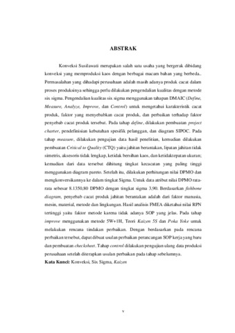 Konveksi Susilawati merupakan salah satu usaha yang bergerak dibidang konveksi yang memproduksi kaos dengan berbagai macam bahan yang berbeda. Permasalahan yang dihadapi perusahaan adalah masih adanya produk cacat dalam proses produksinya sehingga perlu dilakukan pengendalian kualitas dengan metode six sigma. Pengendalian kualitas six sigma menggunakan tahapan DMAIC (Define, Measure, Analyze, Improve, dan Control) untuk mengetahui karakteristik cacat produk, faktor yang menyebabkan cacat produk, dan perbaikan terhadap faktor penyebab cacat produk tersebut. Pada tahap define, dilakukan pembuatan project charter, pendefinisian kebutuhan spesifik pelanggan, dan diagram SIPOC. Pada tahap measure, dilakukan pengujian data hasil penelitian, kemudian dilakukan pembuatan Critical to Quality (CTQ) yaitu jahitan berantakan, lipatan jahitan tidak simetris, aksesoris tidak lengkap, ketidak bersihan kaos, dan ketidaktepatan ukuran; kemudian dari data tersebut dihitung tingkat kecacatan yang paling tinggi menggunakan diagram pareto. Setelah itu, dilakukan perhitungan nilai DPMO dan mengkonversikannya ke dalam tingkat Sigma. Untuk data atribut nilai DPMO rata-rata sebesar 8.1350,80 DPMO dengan tingkat sigma 3,90. Berdasarkan fishbone diagram, penyebab cacat produk jahitan berantakan adalah dari faktor manusia, mesin, material, metode dan lingkungan. Hasil analisis FMEA diketahui nilai RPN tertinggi yaitu faktor metode karena tidak adanya SOP yang jelas. Pada tahap improve menggunakan metode 5W+1H, Teori Kaizen 5S dan Poka Yoke untuk melakukan rencana tindakan perbaikan. Dengan berdasarkan pada rencana perbaikan tersebut, dapat dibuat usulan perbaikan perancangan SOP kerja yang baru dan pembuatan checksheet. Tahap control dilakukan pengujian ulang data produksi perusahaan setelah diterapkan usulan perbaikan pada tahap sebelumnya. Kata Kunci: Konveksi, Six Sigma, Kaizen