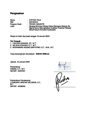 Teja, Steven (2022) Strategi minimasi waste defect berbasis metode six sigma meningkatkan kualitas produksi pakaian (studi kasus konveksi susilawati) (T. Ind - 722). Skripsi thesis, Universitas Tarumanagara.