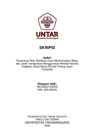 Indra, Ricardo (2022) Penentuan rute distribusi untuk meminimalkan biaya dan jarak transportasi menggunakan metode nearest neighbor (studi kasus rumah potong ayam tumartis) (T. Ind - 729). Skripsi thesis, Universitas Tarumanagara.