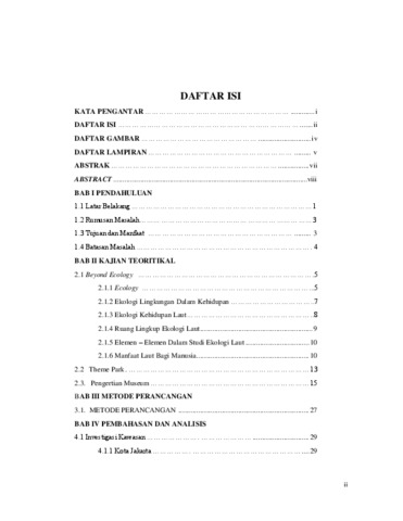 Kemajuan teknologi yang sangat pesat pada zaman sekarang ini, membuat ekosistem kehidupan di bumi menjadi terganggu. Bukan hanya di darat saja terjadi kerusakan ekosistem di laut pun terutama yang disebabkan oleh ulah manusis yang menjadikan laut sebagai tempat pembuangan kotoran baik berupa sampah maupun industri. Salah satu cara mengatasi ekosistem biota laut yang disebabkan oleh kurangnya kesadaran masyarakat terhadap kehidupan biota di laut adalah melalui edukasi yang digabungkan dengan wisata atau rekreasi tepi laut. Isu melampaui ekologi menuju arsitektur untuk kebaikan dan kehidupan sebagai tema soal Stupa 8, memberikan pemikiran bagaimana arsitektur dapat ikut berperan dalam menjaga ekosistem kehidupan di laut. Dalam menjawab peran arsitektur dapat dalam kehidupan di masyarakat, berdasarkan isu dilakukan pendekatan yang menggunakan metode perancangan kontekstual. Metode ini digunakan agar terjadi konteks dari kehidupan biota laut terhadap lingkungan Sunda Kelapa yang menjadi lokasi tapak. Kontekstual yang dijadikan metode perancangan dengan memperhatikan kegiatan yang sudah ada serta sejarah keberadaan pelabuhan Sunda Kelapa serta pernah adanya aquarium pertama di Jakarta. Kehadiran museum biota laut di area Pelabuhan Sunda Kelapa ini, akan melengkapi keberadaan museum bahari, pasar hexagonal sebagai sarana wisata dan rekreasi masyarakat di kawasan kota tua. Dengan memanfaatkan teknologi multi media dalam peragaan materi museum serta adanya aquarium diharapkan dapat menjadi daya tarik masyarakat untuk ingin berkunjung ke museum. Dan terutama dapat berperan mengedukasi masyarakat agar lebih peduli terhadap kehidupan laut yang semakin tercemar. Kata kunci: ekosistem, biota laut, kontekstual, museum, teknologi.