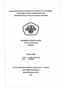 Fellianto, Sandy (2016) Pengaruh [ndependensi, Kompetensi, Due Professional Care, Akuntabilitas, Prof esionalisme Auditor Terhadap Kualitas Audit (Studi Empiris Pada KAP Big Four di Jakarta Tahun 2016). Masters thesis, UNIVERSITAS TARUMANAGARA.