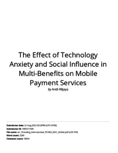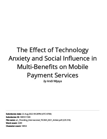 andi wijaya, turnitin (2021) Turnitin The Effect of Technology Anxiety and Social Influence in Multi-Benefits on Mobile Payment Services. The Effect of Technology Anxiety and Social Influence in Multi-Benefits on Mobile Payment Services. ISSN ISSN 2352-5398 / ISBN 978-94-6239-567-1