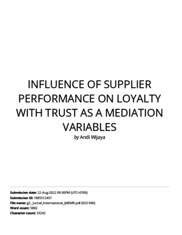 Andi wijaya, Turnitin (2020) Turnitin Influence of supplier performance on loyalty with trust as a mediation variables. Influence of supplier performance on loyalty with trust as a mediation variables. ISSN 2456-3676