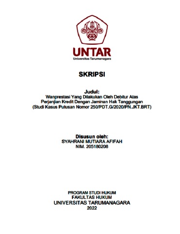 Afifah, Syahrani Mutiara (2022) Wanprestasi Yang Dilakukan Oleh Debitur Atas Perjanjian Kredit Dengan Jaminan Hak Tanggungan (Studi Kasus Putusan Nomor 250/Pdt.G/PN.JKT.BRT). Skripsi thesis, Universitas Tarumanagara.