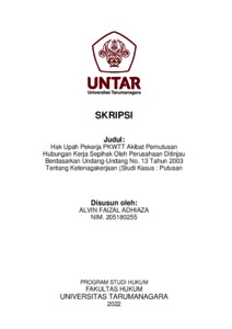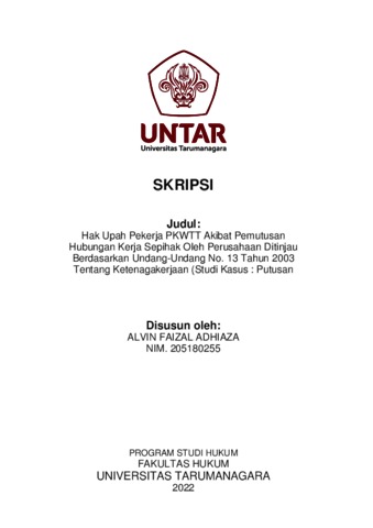 Adhiaza, Alvin Faizal (2022) Hak Upah Pekerja Pkwtt Akibat Pemutusan Hubungan Kerja Sepihak Oleh Perusahaan Ditinjau Berdasarkan Undang-Undang No. 13 Tahun 2003 Tentang Ketenagakerjaan (Studi Kasus : Putusan Pengadilan Negeri Jakarta Pusat Nomor : 134/Pdt.Sus- PHI.G/2019/PN.JKT.PST). Skripsi thesis, Universitas Tarumanagara.