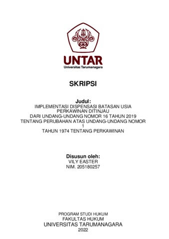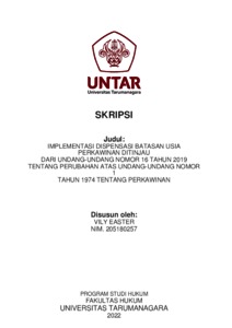 Easter, Vily (2022) Implementasi Dispensasi Batasan Usia Perkawinan Berdasarkan Undang-Undang Nomor 16 Tahun 2019 Jo Undang-Undang Nomor 1 Tahun 1974 Tentang Perkawinan. Skripsi thesis, Universitas Tarumanagara.