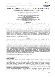 Rasji, Rasji and Djaja, Benny and Valerama, Agung (2021) Aspek Hukum Penggunaan Kekayaan Dalam Pemenangan Pemilihan Kuwu Di Indramayu Tahun 2021. SERINA III Untar 2021. ISSN 2809-509X