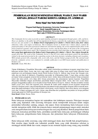 Djaja, Benny and Salsabila, Nada (2021) Pembekalan Hukum Mengenai Hibah, Wasiat, Dan Waris Kepada Jemaat Paroki Kedoya Gereja St. Andreas. Jurnal Bakti Masyarakat Indonesia, 4 (3). pp. 574-581. ISSN 2620-7710