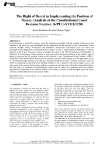 Pratiwi, Retno Indrianita and Djaja, Benny (2021) The Right of Denial in Implementing the Position of Notary (Analysis of the Constitutional Court Decision Number 16/PUU-XVIII/2020). Proceedings of The International Conference on Economics, Business, Social, and Humanities (ICEBSH 2021). ISSN 2352-5398/978-94-6239-423-1