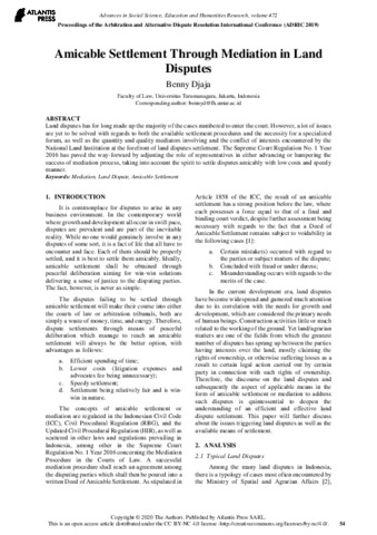 Djaja, Benny Amicable Settlement Through Mediation in Land Disputes. Proceedings of the Arbitration and Alternative Dispute Resolution International Conference (ADRIC 2019), 2019. ISSN 2352-5398/978-94-6239-054-6