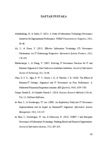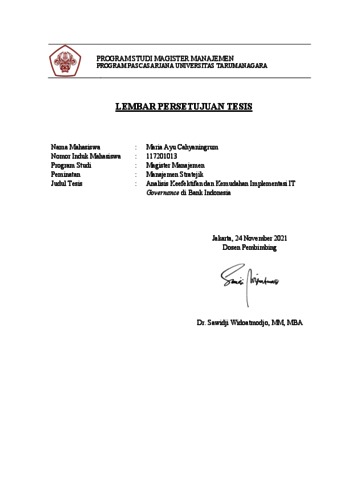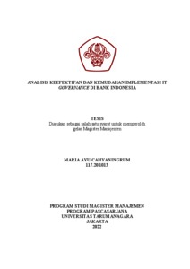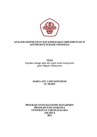 CAHYANINGRUM, MARIA AYU (2021) ANALISIS KEEFEKTIFAN DAN KEMUDAHAN IMPLEMENTASI IT GOVERNANCE DI BANK INDONESIA. Masters thesis, Universitas Tarumanagara.
