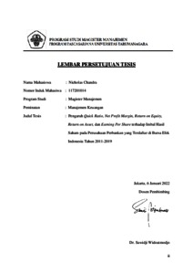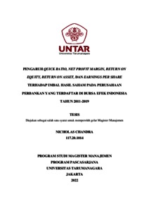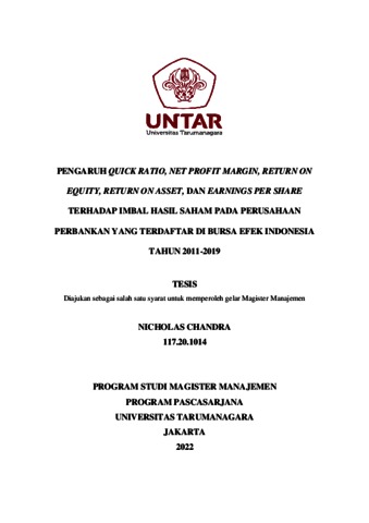 CHANDRA, NICHOLAS (2021) PENGARUH QUICK RATIO, NET PROFIT MARGIN, RETURN ON EQUITY, RETURN ON ASSET, DAN EARNINGS PER SHARE TERHADAP IMBAL HASIL SAHAM PADA PERUSAHAAN PERBANKAN YANG TERDAFTAR DI BURSA EFEK INDONESIA TAHUN 2011-2019. Masters thesis, Universitas Tarumanagara.