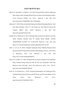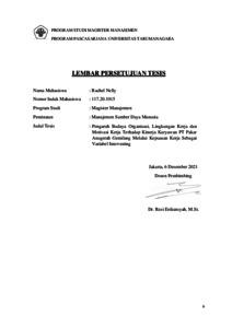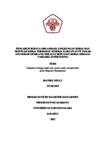 NELLY, RACHEL (2021) PENGARUH BUDAYA ORGANISASI, LINGKUNGAN KERJA DAN MOTIVASI KERJA TERHADAP KINERJA KARYAWAN PT PAKAR ANUGERAH GEMILANG MELALUI KEPUASAN KERJA SEBAGAI VARIABEL INTERVENING. Masters thesis, Universitas Tarumanagara.