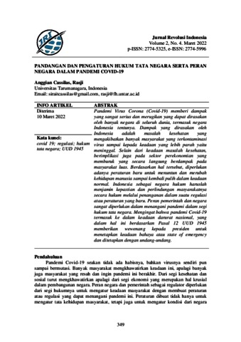 Anggian Cassilas, Penulis 1 and Rasji, Penulis 2 (2022) PANDANGAN DAN PENGATURAN HUKUM TATA NEGARA SERTA PERAN NEGARA DALAM PANDEMI COVID-19. PANDANGAN DAN PENGATURAN HUKUM TATA NEGARA SERTA PERAN NEGARA DALAM PANDEMI COVID-19, 2 (4). pp. 349-356. ISSN p-ISSN: 2774-5325, e-ISSN: 2774-5996