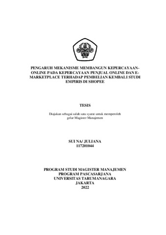 SUI NA, SUI NA (2021) PENGARUH MEKANISME MEMBANGUN KEPERCAYAAN-ONLINE PADA KEPERCAYAAN PENJUAL ONLINE DAN E-MARKETPLACE TERHADAP NIAT PEMBELIAN KEMBALI STUDI EMPIRIS DI SHOPEE. Masters thesis, Universitas Tarumanagara.